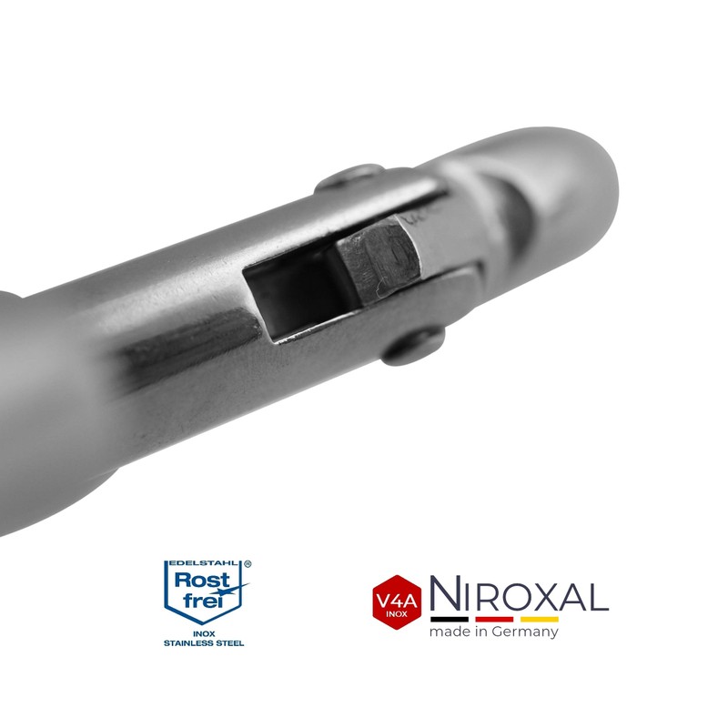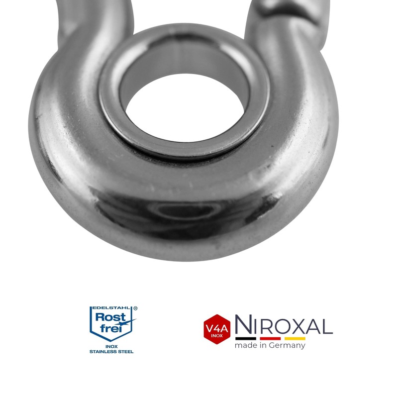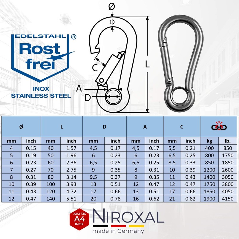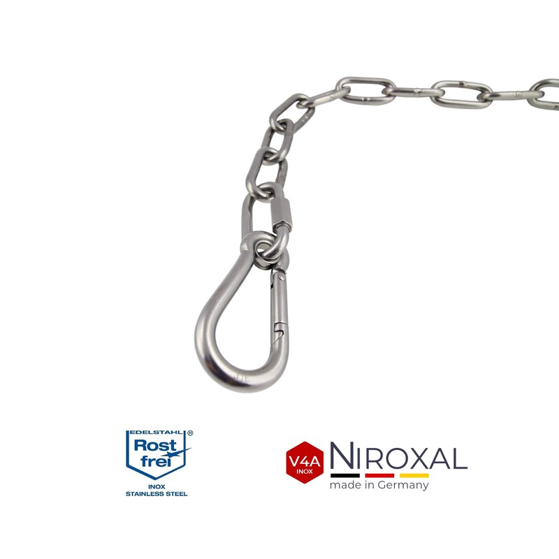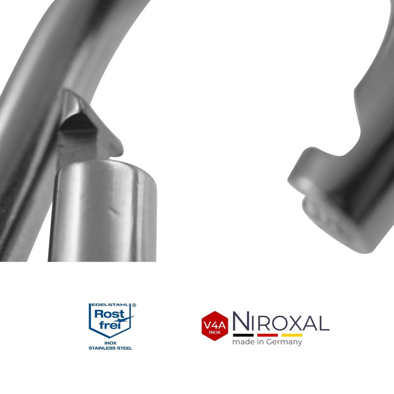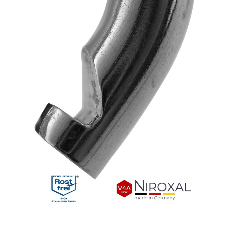 • Features: whether carabiner small or large carabiner, each individual has a thimble (also called eye) and is made of polished V4A stainless steel. This V4A stainless steel is manufactured in industrial quality (1,800 kg snap hook fire brigade carabiner 316 at 10 mm material thickness). Even cleaning is not a significant effort by simply rinsing. Corrosion infestation is not possible thanks to the rust-proof material, even in maritime environments.