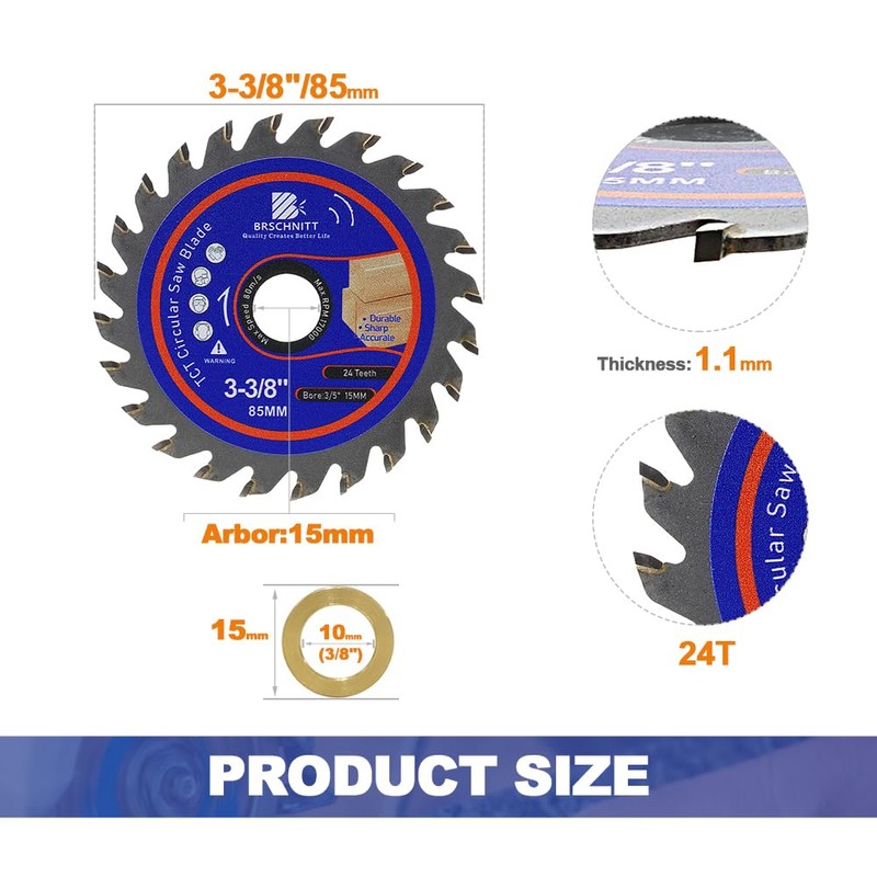 - Size -- Diameter: 3 3/8"(85mm), Blade thickness:1.1mm, Arbor:3/5"-3/8"(15/10mm),Tooths:24T, Recommended RPM:10000,MAX RPM 17000.