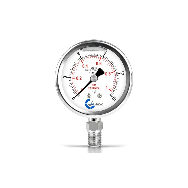 CARBO Instruments 2 1-2" Pressure Gauge, All Stainless Steel Wetted Parts, Case, Connection, Liquid Filled, 0-15 psi/kPa, Lower Mount 1/4" NPT