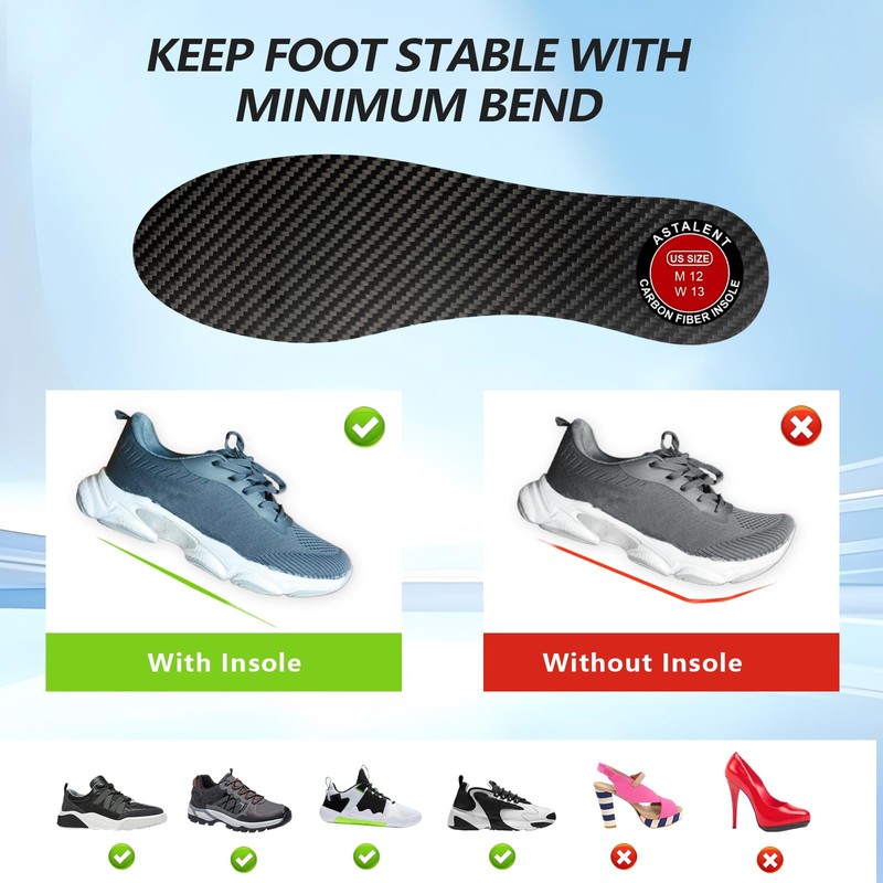 - Protect Your Feet: This Carbon Fiber Insoles is 1.3 mm thick with 180-degree flat plate design, allow minimizes bending (extremely low flexibility) for optimal stability. Rigid structure enhances shoe stiffness, restricts foot over-movement, and reduces pressure on the metatarsal bones. Alleviate foot pain and accelerate recovery. Works with athletic footwear like sneakers, Baseball/Tennis cleats, Golf shoes, Soccer/Basketball shoes. Not for dress shoes and high heels.
