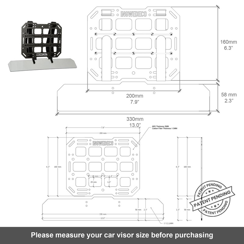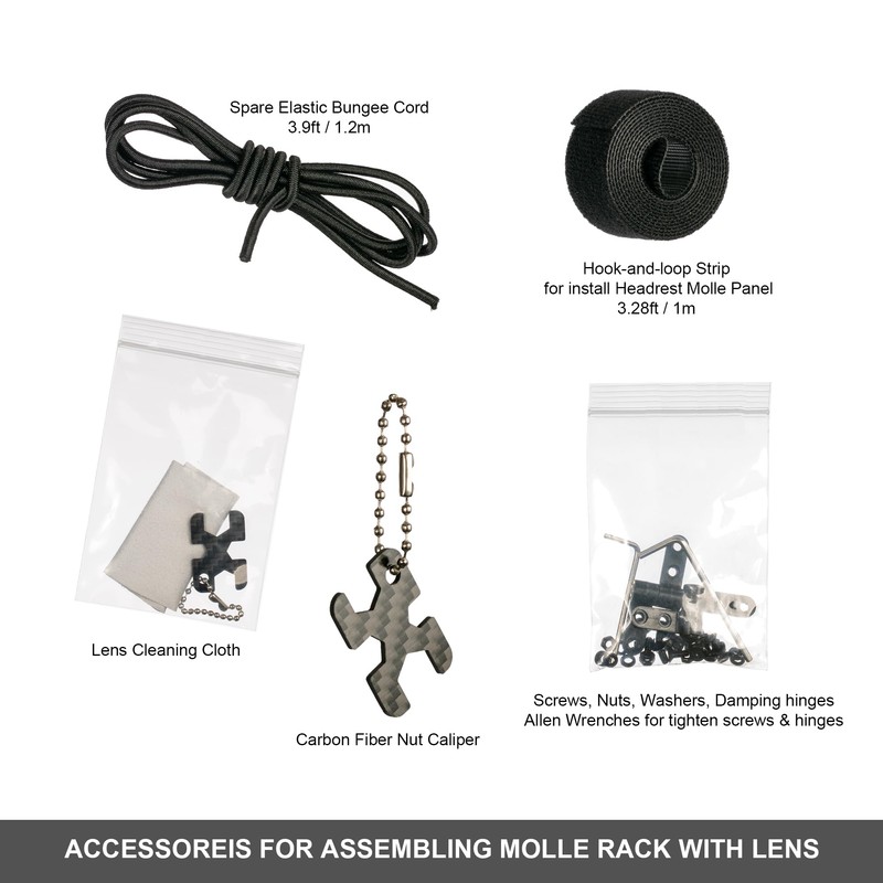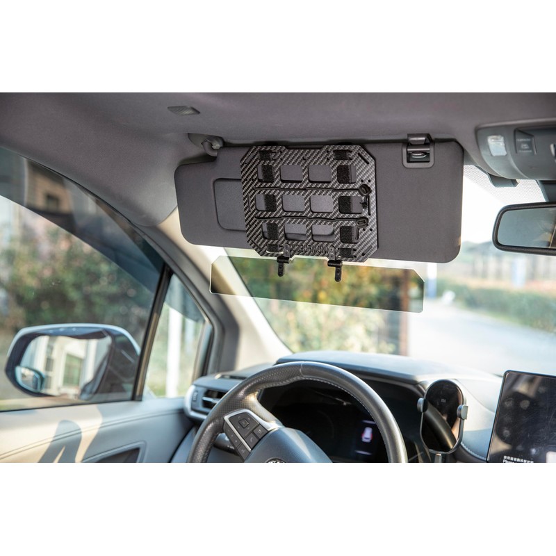 【Universal Fit 】This molle panel can be installed on car visor OR seat headrest compatible with most vehicles Cars Trucks SUVs. The molle panel alone can be installed as car seat headrest organizer to hold tactical gears. 【Premium Material】This MOLLE panel is Matte Twill 3k Carbon Fiber board, lightweight, sturdy and endurance, no smell, high temperature and weather resistant, high load-bearing capacity that not easy to deformed and breakage. The visor extender is made of upgraded anti-glare polarized lens. It blocks harmful UV rays and dazzling reflected lights. It eliminates visual fatigue or discomfort to enable clear vision even under extreme sunlight. Polarized lenses effectively block horizontal light waves, such as glare reflecting off surfaces like water, snow, or the road. This dramatically reduces glare, enhancing visual clarity and reducing eye strain. This reduces the risk of long-term eye damage and conditions like cataracts and macular degeneration. 【Specs】Width 7.9“ * Height 6.3"" * Thickness 0.06"". Weight: ???oz. Polarized lens: Width 13“ * Height 2.5"" * Thickness 0.09"". Weight: ???oz. 【Multifunction】This Rigid Molle Panel Organizer with Adjustable Anti-Glare Upgraded Polarized Sun Visor Externder can be used as vehicle visor organizer, good for keeping your essential items handy, secure, organized, and at your fingertips. The polarized anti-glare visor extender blocks harmful UV rays and dazzling reflected lights. The angle of the polarized lens can be adjusted according to driving habits and light environment. It eliminates visual fatigue or discomfort to enable clear vision even under extreme sunlight. Polarized lenses effectively block horizontal light waves, such as glare reflecting off surfaces like water, snow, or the road. This dramatically reduces glare, enhancing visual clarity and reducing eye strain. This reduces the risk of long-term eye damage and conditions like cataracts and macular degeneration. 【Enhancement Option】Strong sunlight sometimes leaks from the edge of sun visor from the passenger side that interferes with the driver's vision. You can have the optioin to install a side anti-glare visor which effectively blocks dazzling lights to ensure driving safety Easy Self-installation】The product package contains the molle panel, polarized lens, mounting accessories, and spare extension mounting straps and elastic cords. First, you need to mount polarized lens with the molle panel. Open the mounting accessories package, use the screws, nuts, washers, allen wrenches and nut calipers to fix the polarized lens to the molle panel. CAUTION: NOT overtighten screws on the polarized lens, which will cause polarized coating discoloration. The mounting straps and elastic cords are pre-installed with the molle panel. Loosen one side of the sun visor, then thread the 2 mounting straps through your visor, adjust and thghten the hook and loop straps on both side of the panel with visor. Flip the vior and adjust the angle of polarized lens, this setup is ready to go! MOLLE slots and elastic string offer different mounting options for different equipment, the customized layout gives you full control of where your accessories are so you can quickly reach out and take them. 【Handy and Adjustable】This molle panel can be used as vehicle visor organizer, good for keeping your essential items handy, secure, organized, and at your fingertips. it holds tactical gear & essentials, EDC/emergency rescue tools, multitool, sunglasses, flashlight, gloves, pocket knife, pen with glass break tip, and MOLLE pouches etc. for quick grabs and use. The angle of the polarized lens can be easliy adjusted according to driving habits and light environment. 【Complete Kit Included】Visor/Headrest Molle Panel *1; polarized lens *1, installration accessories package, adjustable Strap *2; 3.9ft/1.2m Elastic Bungee Cord *2; 3.28ft/1m Hook-and-loop Strip *1; Cord Lock *2, lens cleaning cloth *1.
