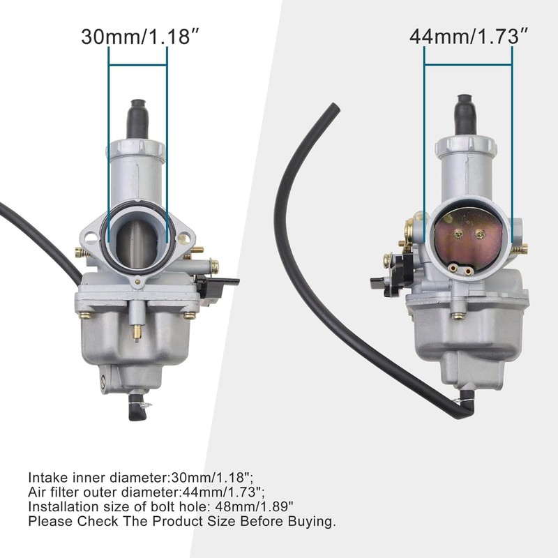 - Bolt hole spacing: 48mm; Intake inside diameter: 30mm; Air filter mount outside diameter: 44mm