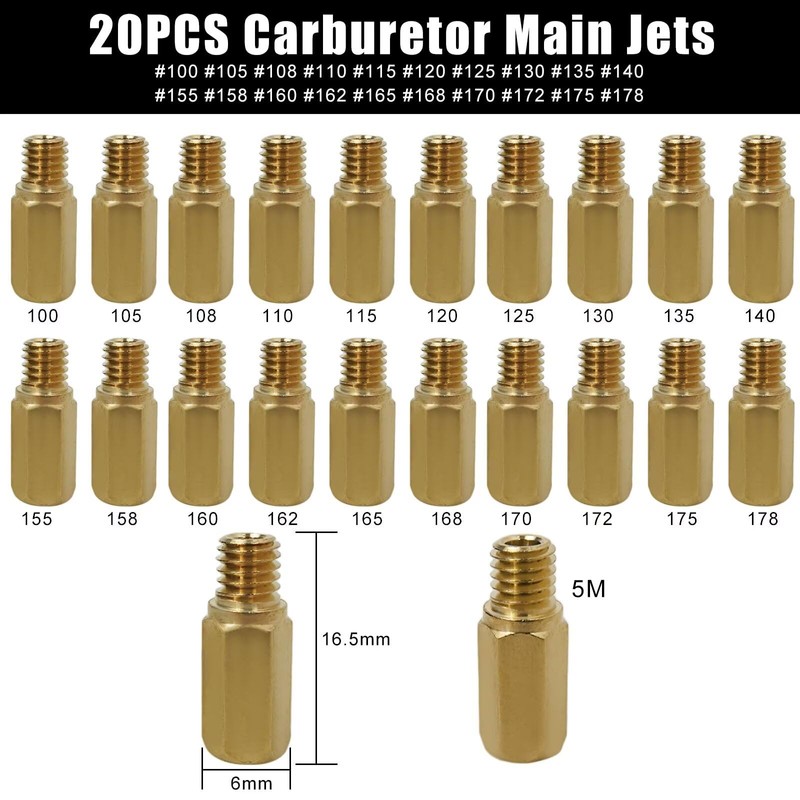 - Carburetor Main Jet(#100 - #140): #100 #105 #108 #110 #115 #120 #125 #130 #135 #140(PWK 21mm-34mm), Thread pitch: 4.7 x 2.5 mm,Nut diameter: 5.7 mm, Thread length: 5 mm, Overall length of the hole: 7.9 mm. Carburetor Main Jet(#155 - #178)(PWK 28mm-42mm): #155 #158 #160 #162 #165 #168 #170 #172 #175 #178, Thread pitch: 5 x 0.8 mm,Thread length: 5mm,Nut diameter: 6mm