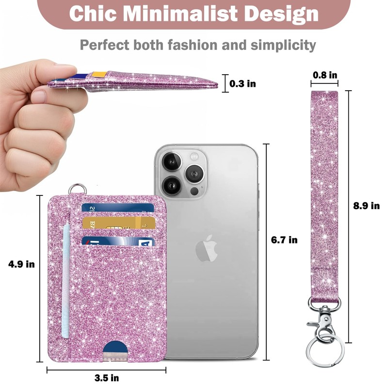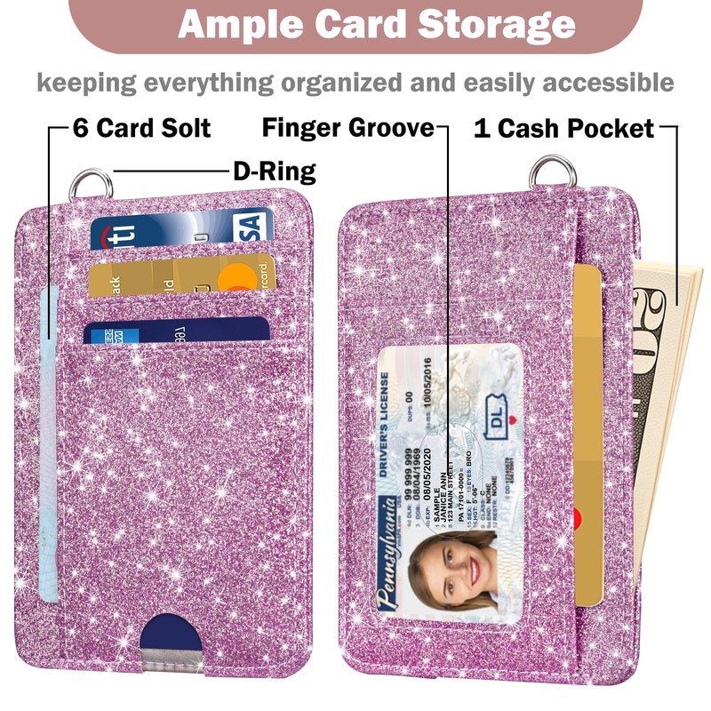 Card Holder Keychian and Lanyard Wallet Front Pocket Minimalist Travel Cute Funny Thin Leather With RFID Blocking Small Credit Card Holder Wallet for Men & Women Girls Organizer Gifts, Glitter Purple