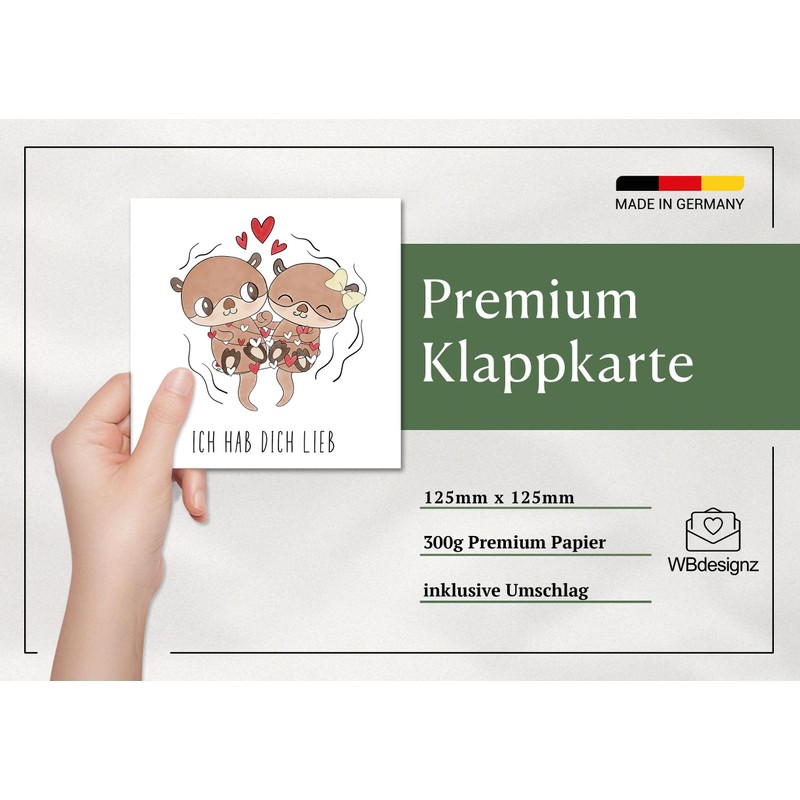 In the world of emotions, there are moments that deserve very special words of love and affection. Our love card with the sincere saying "Hab Dich Lieb" offers you a heartfelt way to express your deep feelings in a unique way and put a smile on your loved one's face. The design of this love card exudes a delicate romance. The lettering "Hab Dich Lieb" appears in elegant black writing on a pure white card, emphasising the simplicity and honesty of love. Above the saying there is an enchanting otter couple who lovingly holds on their hands. This sweet motif symbolises the deep bond and affection between you and your favourite person, adding a warm touch to the card. Our love cards are printed with the utmost care on 300gsm premium paper, which ensures a comfortable feel and durability. Designed in a modern square format and designed as a folding card, they offer enough space for personal messages and tender words of love. The card is easy to open and close, making it particularly easy to use. The enclosed brown kraft paper envelope gives your love card a rustic and natural charm. This contrast highlights the special character of your love and conveys your message in a warm and authentic way. This love card is an ideal gift for Valentine's Day, wedding anniversary, anniversary or simply to show your lover how much you appreciate him or her at all times. It is also a loving gesture for friends and family members to express your affection and your "Love You". Share your love and affection in a warm and unique way. Order our love card "Hab Dich Lieb" now and let your love speak in the form of a card that comes from the heart and gives your loved one joy and comfort.