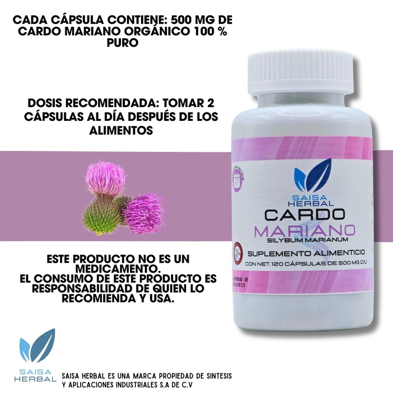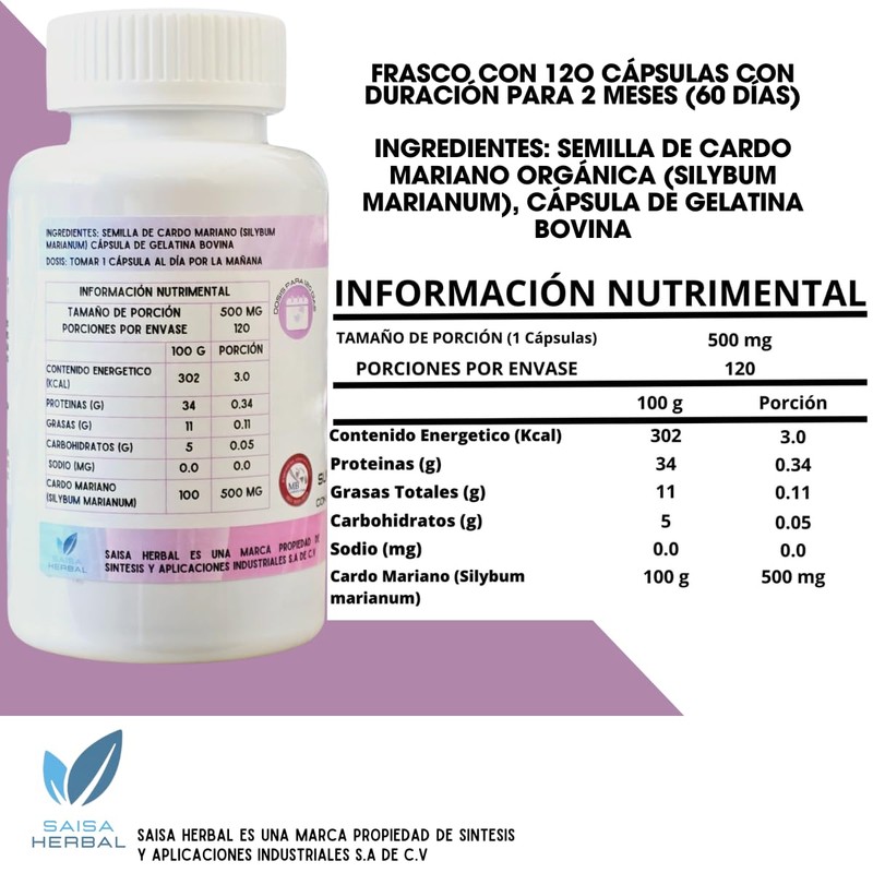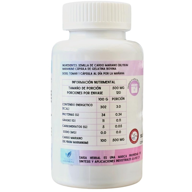 Cardo Mariano puro con 120 cápsulas de 500 mg c/u.