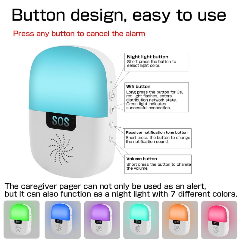 - 【Dual Alarm with Audible and Visual Signals】: In the event of an emergency, when the life caregiver call button is pressed, the caregiver pager will emit an audible alarm upon receiving the signal. Additionally, a built-in LED indicator in the SOS area will flash to notify the caregiver. The emergency alert system provides a choice of 8 different ring tones and allows for adjustment of volume levels, ranging from 0dB to 90dB. A silent mode option is available, accompanied by LED flashing.