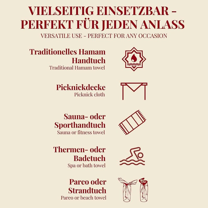 - VIELSEITIGER EINSATZ - Die Hamam Badetücher eignen sich perfekt als Strandtuch zum Baden sowie als Sauna-Tuch oder in der Therme - Auch einsetzbar als modischer Pareo / Picknikdecke / Sporttuch.