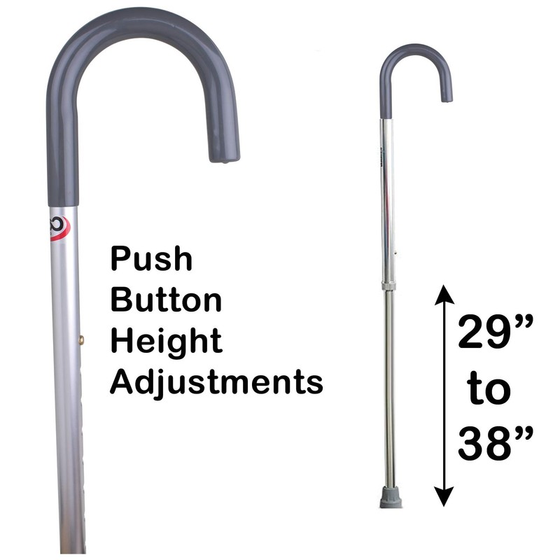 - HEIGHT ADJUSTABLE CANE: The Carex aluminum cane for men is a round handle cane, silver in color. It has an adjustable height of 29" to 38" with a soft grip handle.