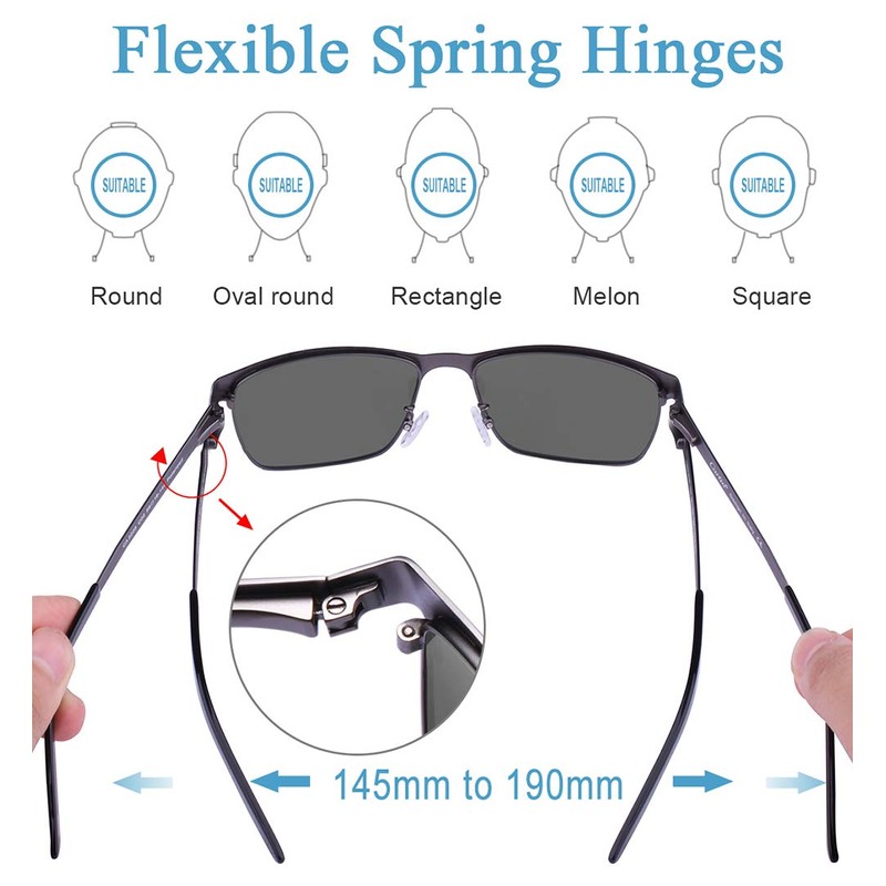 - Metal Sunglasses for Men: Full rim frame made from corrosion resistant metal, ergonomically construction make it feels sturdy and comfortable. Getting the right fit is essential for your comfort, protection and even optical performance. CARFIA has adjustable nose-pads and Spring hinges to fit your head nicely - Flexible from 90 degrees to 105 degrees. Product Size: Lens width: 58 mm, Lens height: 45 mm, Bridge: 16 mm, Arm: 145 mm, Frame width: 141 mm