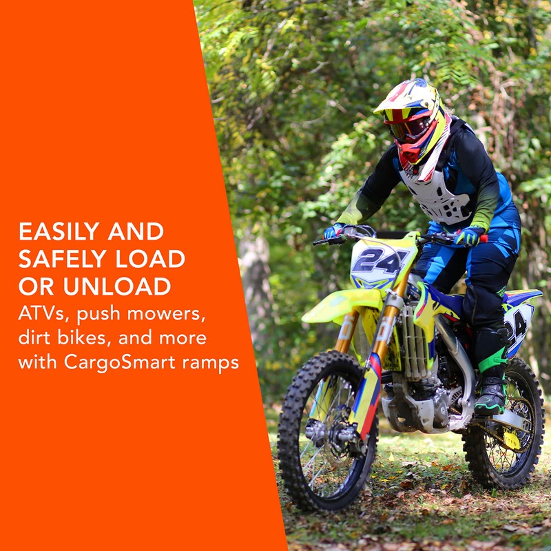• LIGHTWEIGHT RAMP — CargoSmart ramps are easy to transport & carry. These fixed loading ramps have a distributed load capacity of 1,250lb per pair and 625lb per ramp if used individually. Easily and safely load/unload ATVs, push mowers, dirt bikes & more.
