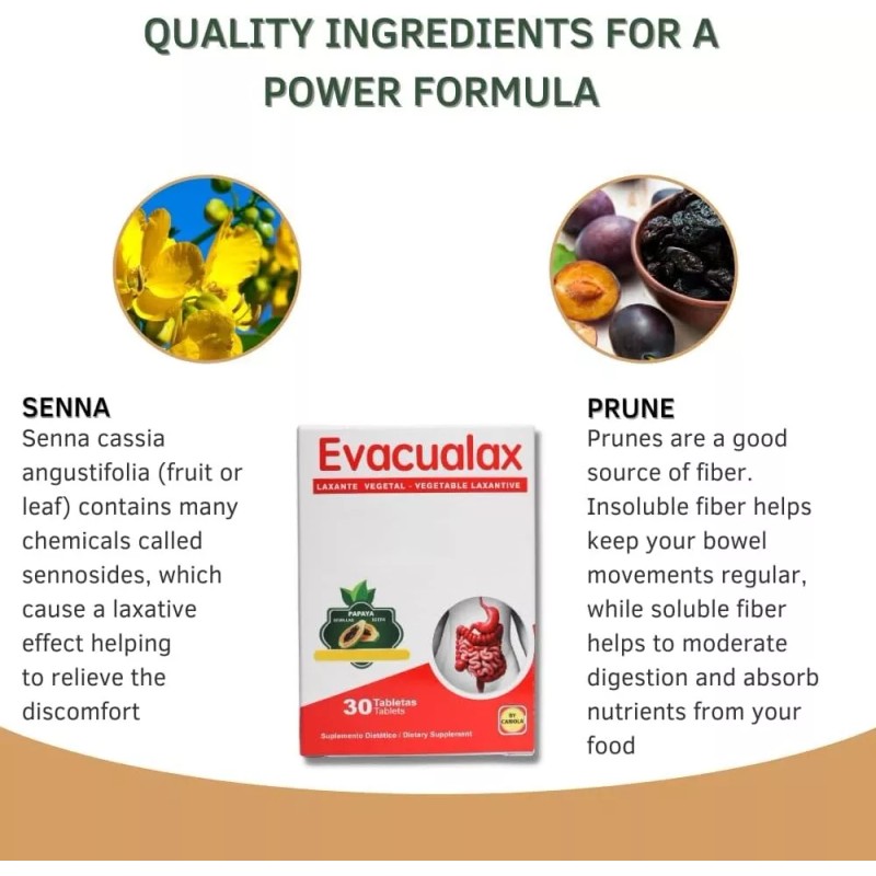 Formulated with carefully extracted natural components, Evacualax ensures the highest concentration, quality, and purity. The main ingredient, Senna (Senna Cassia angustifolia), contains sennosides that stimulate a laxative effect to relieve discomfort. It’s also enhanced with papaya seeds, which contain proteolytic enzymes that support digestion.
