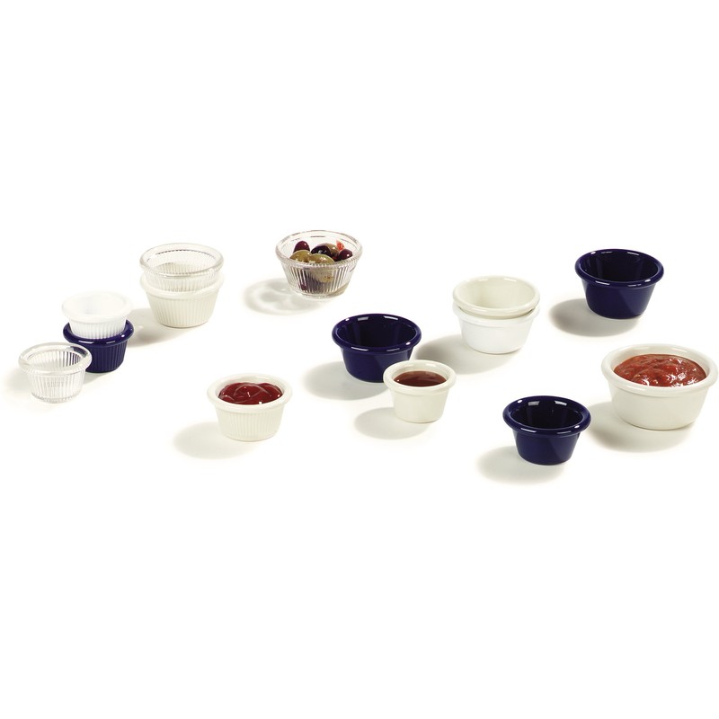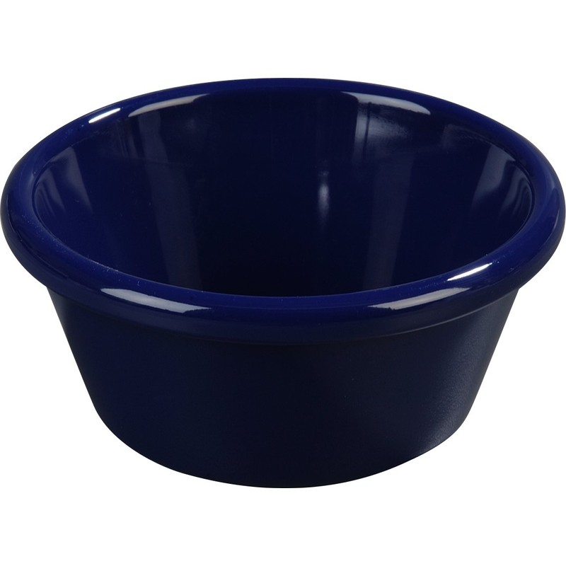 The Carlisle 4312660 SAN smooth ramekin is round, cobalt blue-colored, and suitable for holding and serving butter, salsa, a sauce, a salad dressing, or another food. The ramekin is made of SAN (styrene Acrylonitrile resin) for durability and resistance to heat and is dishwasher-safe. The rim helps prevent drips and spills. Two or more ramekins can be stacked for storage. The ramekin measures 1.80"/4.57 cm high and 3.90"/9.91 cm in diameter at the top. It has a 6.00 oz./0.18 liter capacity. It is free of BPA (Bisphenol a) to address food safety concerns raised by the U.S. Food and Drug Administration (FDA) and other organizations. Carlisle manufactures food service equipment and supplies and sanitary maintenance tools and supplies for commercial, industrial, and institutional facilities. The company, founded in 1954, is headquartered in Oklahoma City, OK.