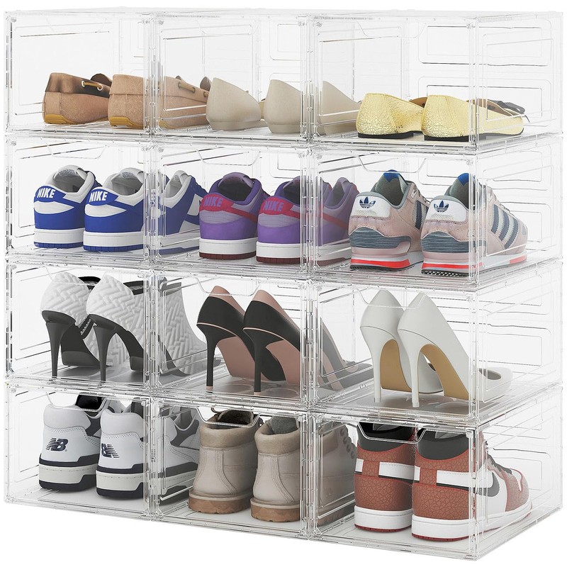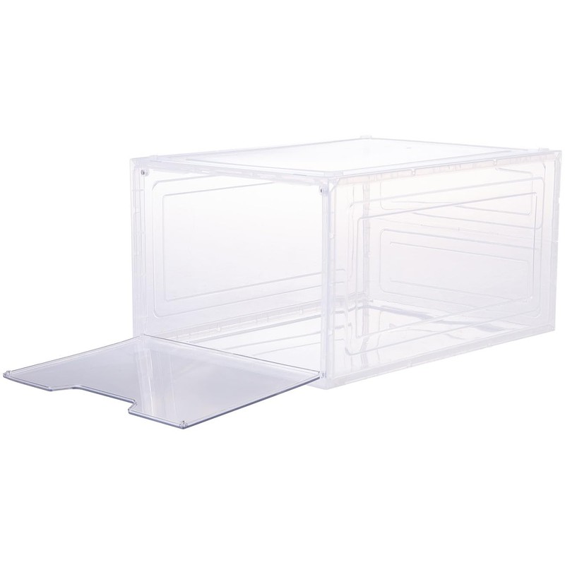 - Transparent and stackable up to 12 rows Access at any time via magnetic flap High-quality plastic Versatile For shoes up to size 47 Dimensions: 34 x 25 x 18 cm