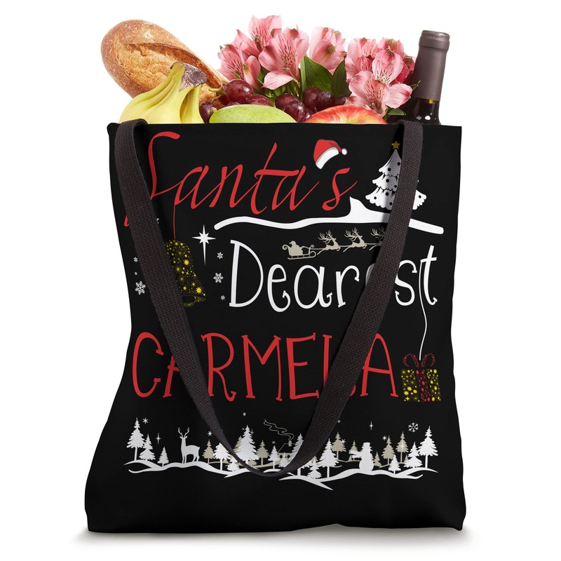 • Personalized Christmas season themed gear. The lovely design features Santa Claus on his sleigh with reindeers, a winter landscape, a Christmas gift and bell. It gives the design a happy look – for Xmas lovers who are proud of (being called) Carmela.