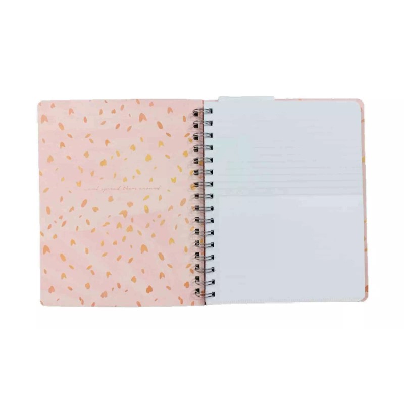 This notebook line features heavyweight covers with silver foil uplifting phrases, a pocket on the first page while the inside front cover containing the phrase “…. every step along the way,” with both covers having decorative insides on mint green, two poly tabs to divide the notebook into 3 sections, a sturdy double wire spiral binding, and perforated pages for easy removal.