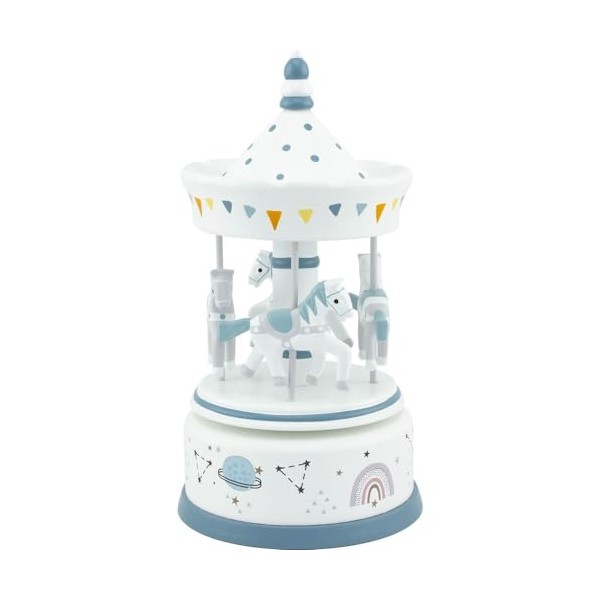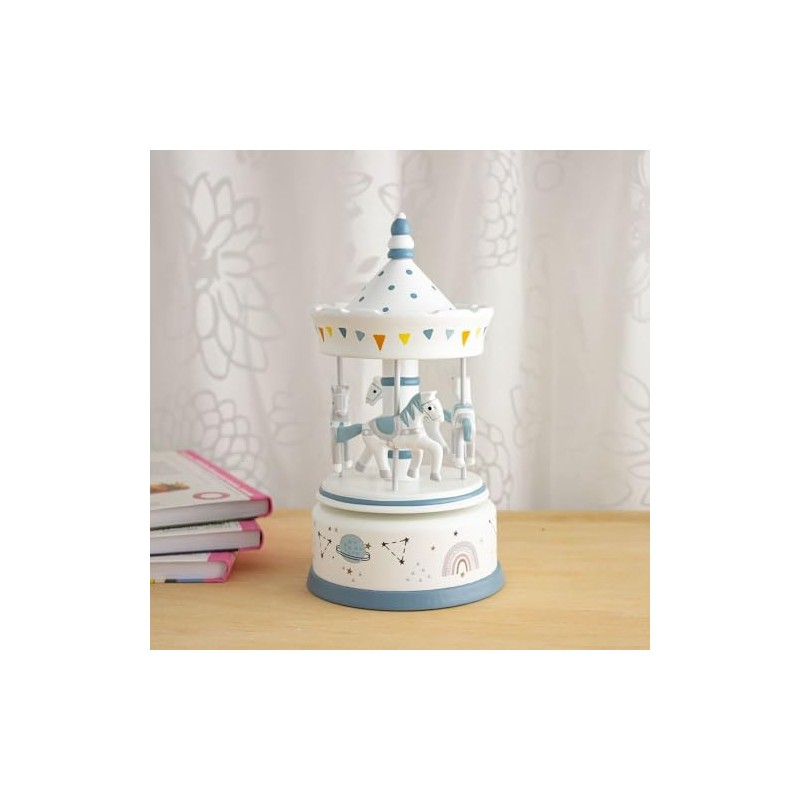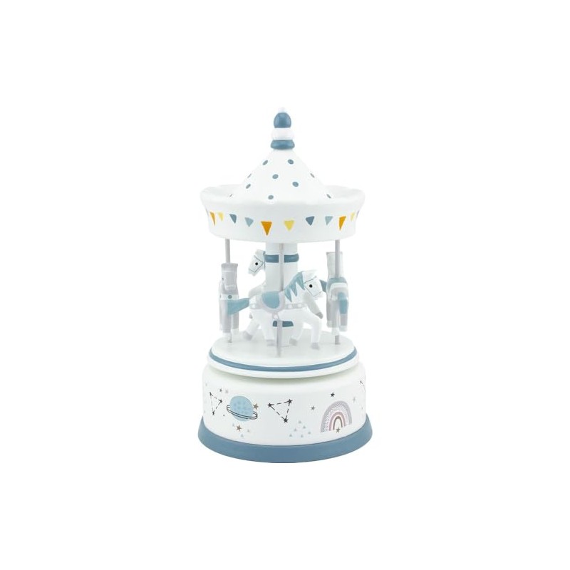 - Discover our grey blue wooden carousel, decorated with small horses in delicate design and soft colours. It is accompanied by a music box that plays the traditional American lullaby "All the pretty little horses". To activate the music, hold the lower part of the carousel firmly while turning the tent clockwise. This toy will delight young and old with loving details and gentle music.