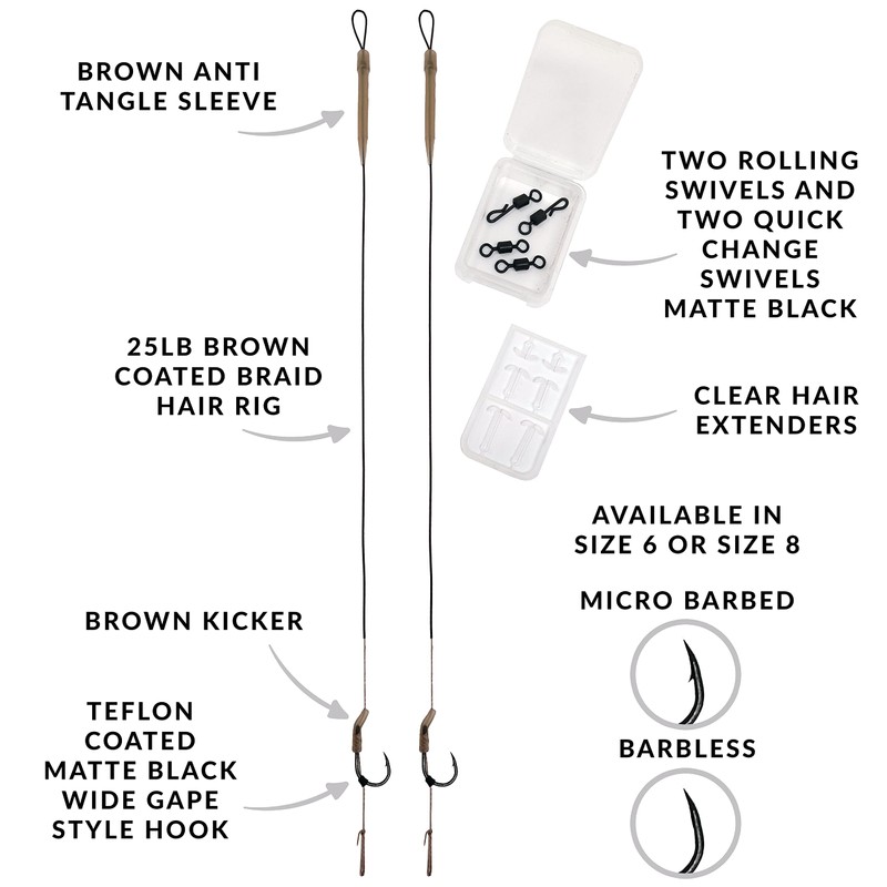 - 25lb Braid - 2 x 25lb camo brown coated braid hair rigs with brown kickers, brown anti-tangle sleeves and silicon tube