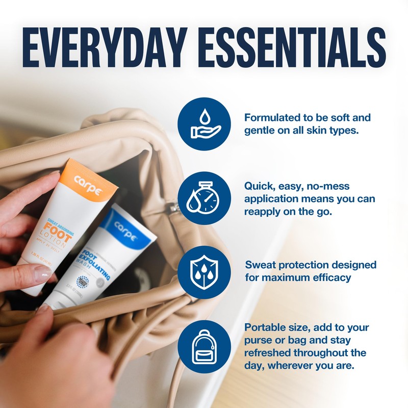 - Smelly Feet, Solved: Carpe's Foot Exfoliator and Sweat Absorbing Lotion duo is your ultimate solution for foot odor. Use the exfoliating pre-wash to remove dead skin and odor-causing bacteria, and follow up with our powerful sweat-absorbing foot lotion to keep feet fresh all day by absorbing sweaty moisture.