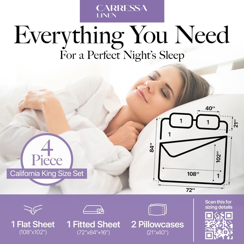 • Designed To Fit Your Mattress Perfectly: The complete 4 piece cal king cotton sheet set includes: 1 flat or top sheet (108’’ W x 102’’ L), 1 fitted or bottom sheet (72” W x 84” L + 16” deep pocket), and 2 King size pillow cases (21” W x 40” L). Our fitted sheets are longer with extra deep pockets for mattresses up to 18 inch and an all-around elastic to go over for a perfect fit. Head and foot tags help to make the bed quickly.