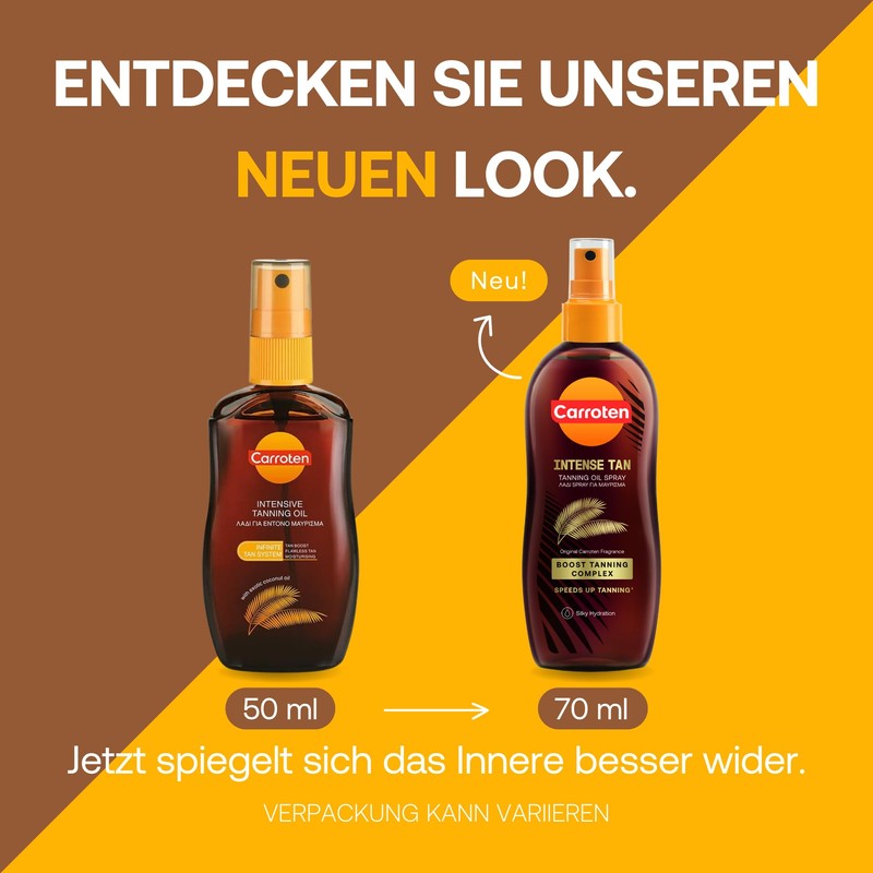 ProduktbeschreibungenBr?unungs?l fr tolerante Haut. Fr eine schnelle und tiefe Br?une dank des enthaltenen Vitamin A, Karotten?ls und goldenen Palm?ls. Die Textur des Produkts ist reich an feuchtigkeitsspendenden ?len und intensiven Feuchtigkeitsspendern, die fr eine gleichm??ige und lang anhaltende Br?une sorgen.Als Br?unungsexperten stellen wir Br?unungsprodukte her, die fortschrittliche Br?unungs- und Kosmetiktechnologien enthalten und eine sch?ne Br?une bei gleichzeitiger Tiefenpflege der Haut erm?glichen.Aufsprhen Sie gro?zgige Menge des ?ls gleichm??ig und reichlich auf dem gesamten K?rper und die Anwendung h?ufig wiederholen, insbesondere nach dem Baden, Abtrocknen und Schwitzen. Die Augenpartie ist strikt zu vermeiden. Setzen Sie sich in der Mittagszeit (10-16 Uhr) nicht der Sonne aus. berm??ige Sonnenbestrahlung, selbst bei Verwendung von Sonnenschutzmitteln, stellt ein ernstes Gesundheitsrisiko dar. Das Produkt enth?lt keine UV-Filter und schtzt daher nicht vor UV-Strahlung. Das Produkt enth?lt Inhaltsstoffe, die Stoffe verf?rben k?nnen.GebrauchsanweisungSprhen Sie eine gro?zgige Menge des ?ls gleichm??ig und reichlich auf dem gesamten K?rper auf und wiederholen Sie die Anwendung h?ufig, insbesondere nach dem Baden, Abtrocknen und Schwitzen. Die Augenpartie ist strikt zu vermeiden. Setzen Sie sich in der Mittagszeit (10-16 Uhr) nicht der Sonne aus.WarnhinweiseAvoid the eye area.