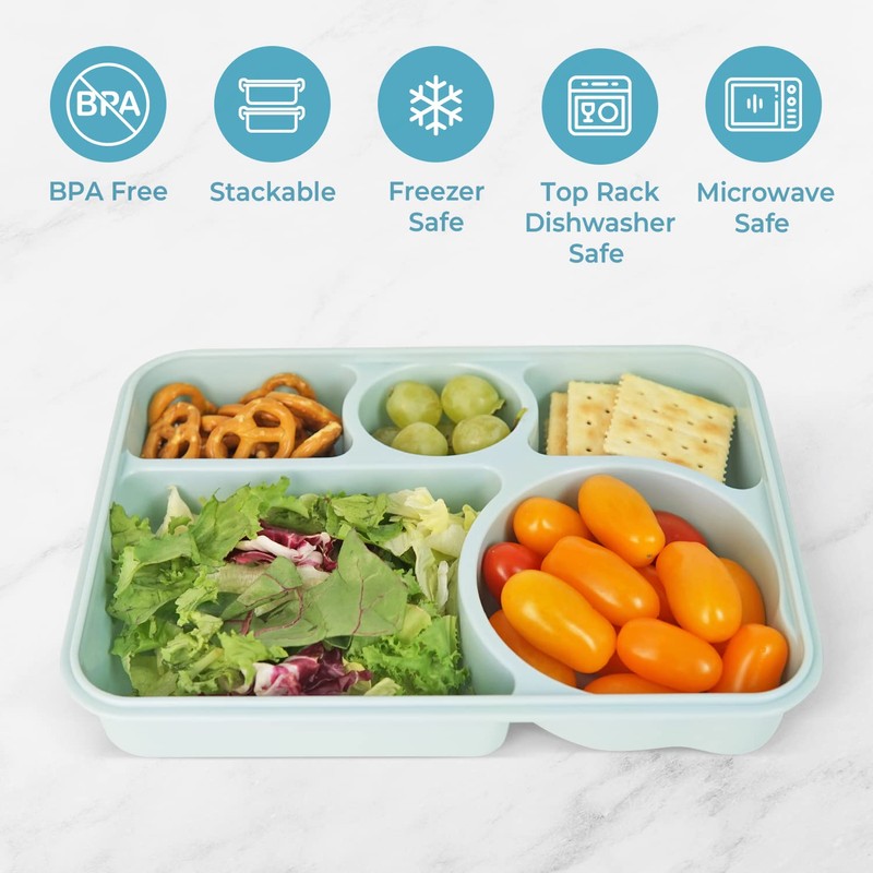 - 5 divided compartments can be particularly useful in achieving these goals, as they offer a visual guide for how to portion your food and make meal prep easy and convenient.