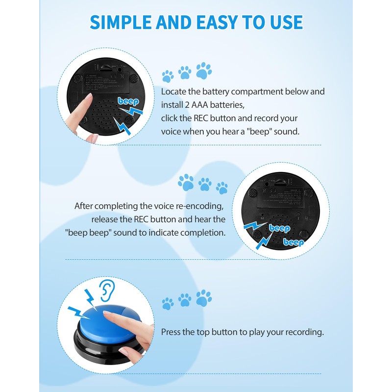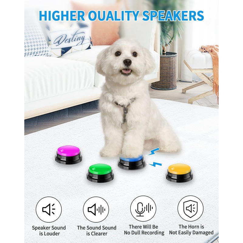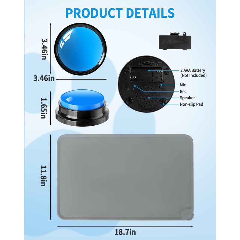 - 🐾【30 Seconds Clear Recording】With built-in storage unit, our buzzer button allows you to record up to 30 seconds of clear sound. your voice or any other sound. (Note: Each recordable button requires 2 AAA batteries, batteries not included)