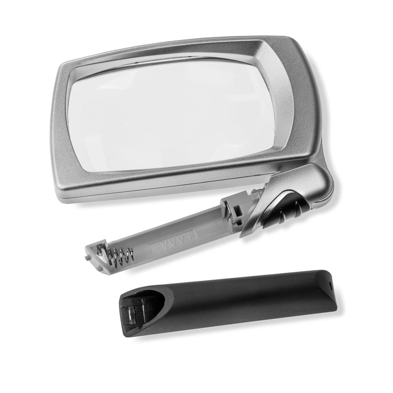 - LED lighted rectangular magnifier with 2.5x magnification.