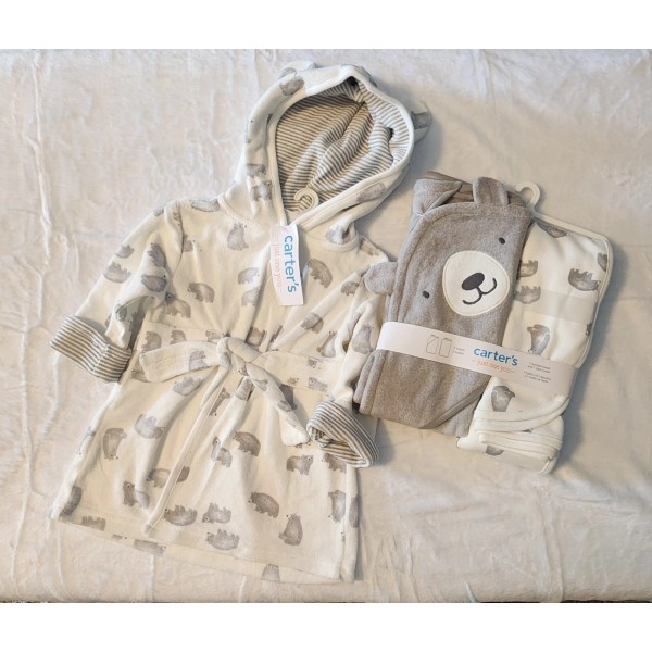 Carter's Just One You Baby Hooded Towel, Bath Towel & Robe Set Gray Bear Theme