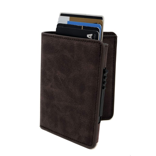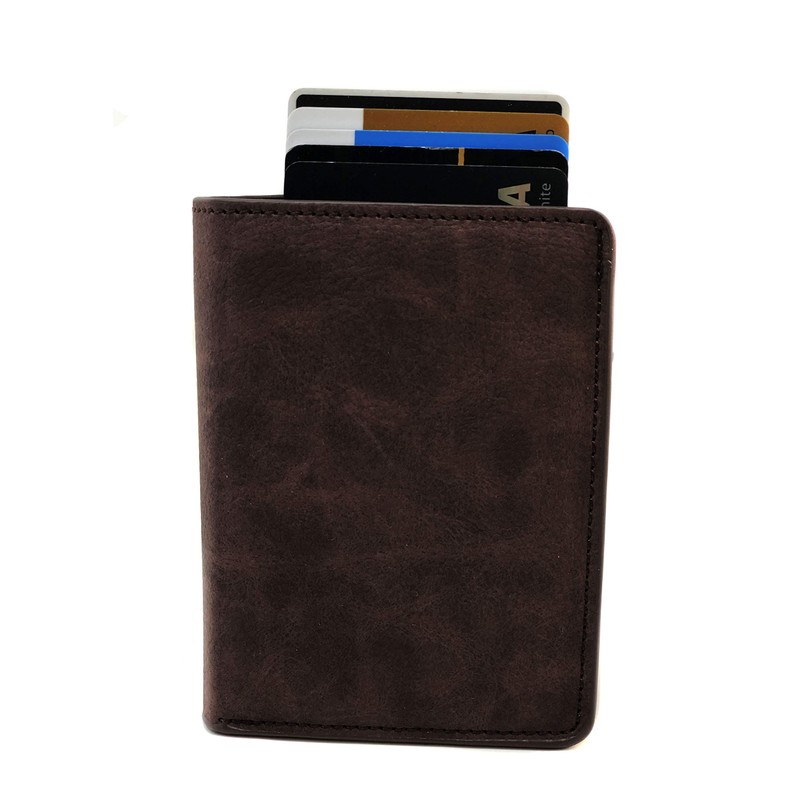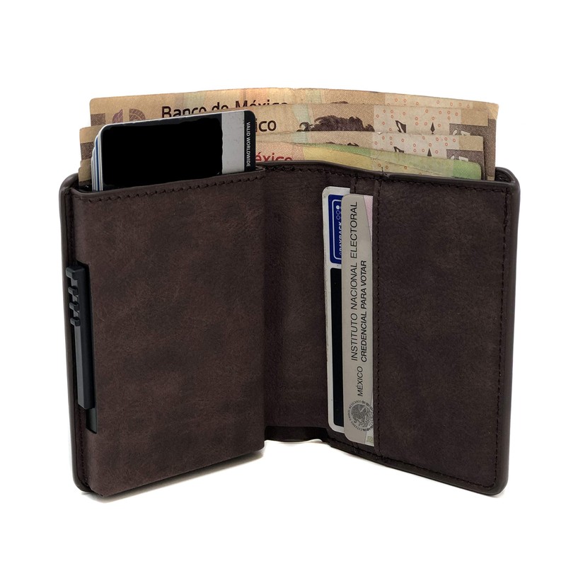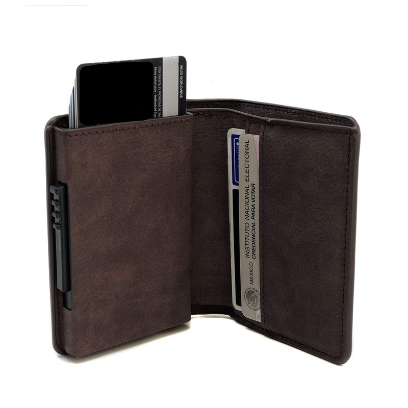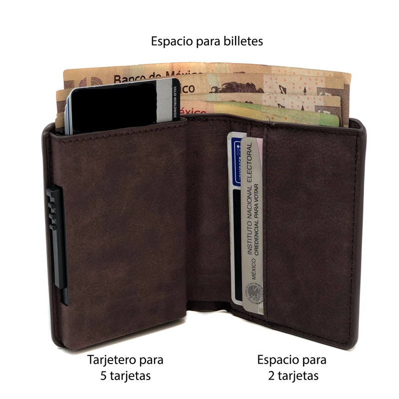 - Material: Cuero con cuerpo de aluminio que protege las tarjetas de crédito/débito (RFID).