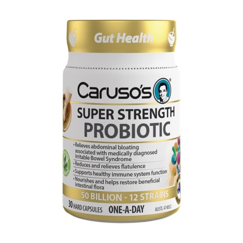 Caruso's Super Strength Probiotic has been formulated to support your digestive system function and health. By relieving abdominal bloating and flatulence, particularly for those with medically diagnosed Irritable Bowel Syndrome (IBS), this product helps ease discomfort while nourishing friendly intestinal flora. Additionally, it supports a healthy immune system and helps to maintain general health and wellbeing.