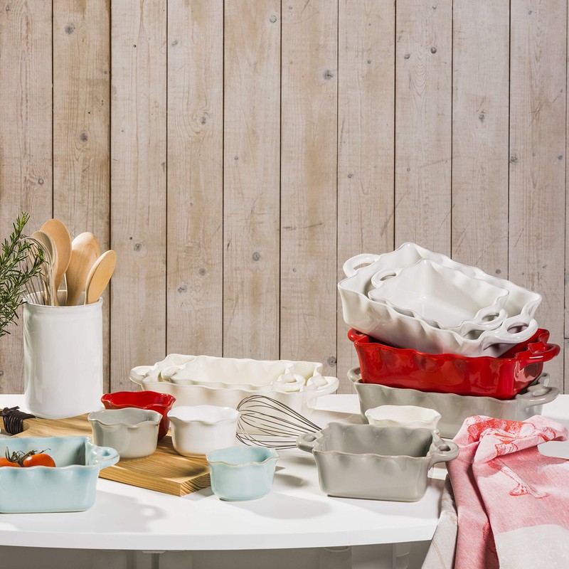 - COLORFUL - Our fine stoneware ruffled bakers are available in five colorways - white, cream, blue, red and grey - and three sizes: large and medium rectangles and a new smaller square alongside with new oval ramekins perfect for individual courses. New serveware items complete the collection and they all match with many others dinnerware collections.
