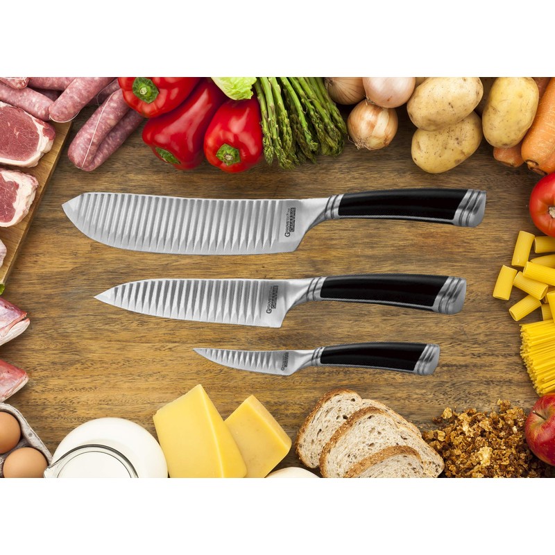 The CasaWare 3pc Classic Knife set includes the three knives that are most useful in the kitchen. The set includes an 8” All Purpose Knife, a 6” Chef Knife and a 3.5” Paring Knife. The 8” All Purpose knife is multifunctional. You can use it for a Chef cut, as a Cleaver, a Mezzaluna and a Santoku. The 6” Chef knife is the classic all-around kitchen knife and the 3.5” Paring Knife is ideal for fruits and vegetables. All three knives include a forged Full Tang Japanese Stainless Steel blade that will give you superior quality and durability. The patented Groovetech technology creates a natural non-stick effect that pushed food away from the blade and prevents it from sticking. The ergonomic handles are designed to fit comfortably in your hand and can be used by both left and right handed people. The knives have a 15 degree angle on each side of the blade. The Rockwell hardness is RC53. The blades can be sharpened by most knife sharpeners that are sold in your department or specialty stores. The knives come in a gift box for storage.