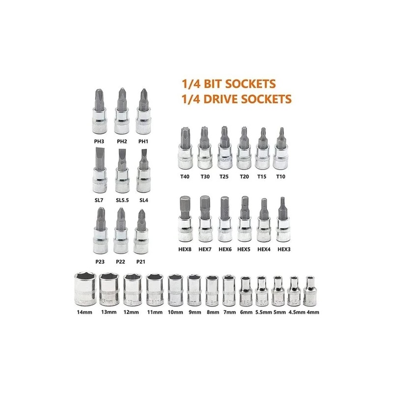 21pc-BIT SOCKETS:SL4,5.5,7 PH1,2,3 PZ1,2,3 HEX3,4,5,6,7,8, T10,15,20,25,30,40
