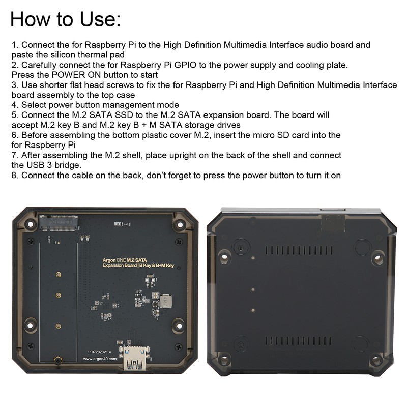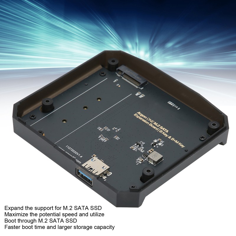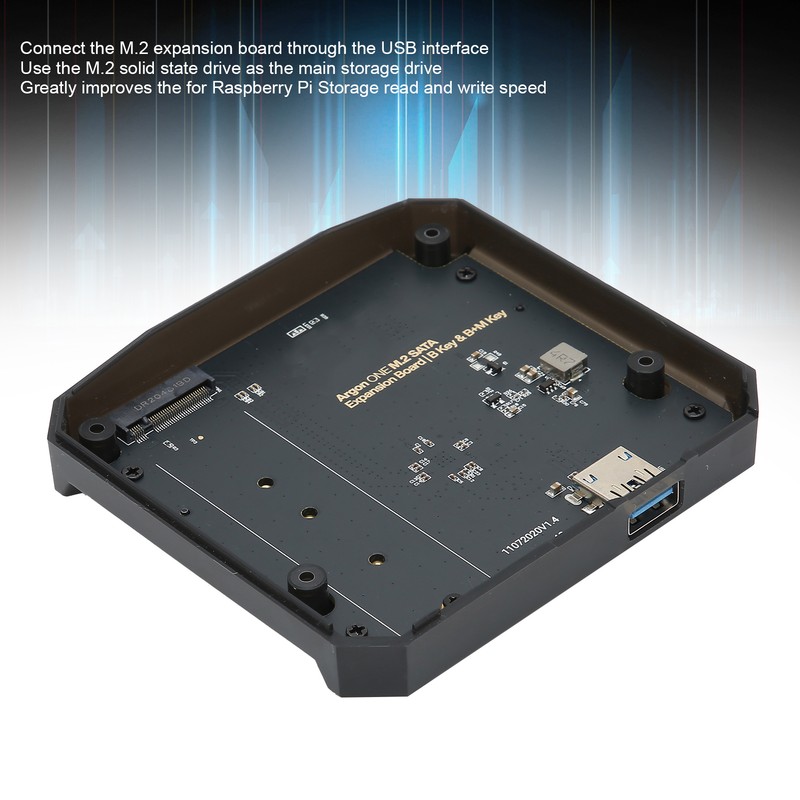 1、The M.2 expansion board expands the support for M.2 SATA SSD to maximize the potential speed of for Raspberry Pi 4B and utilize. Now you will be able to boot through M.2 SATA SSD to achieve faster boot time and larger storage capacity 2、The for Raspberry Pi 4B is normally booted with a TF card by default, which is not as fast as the M.2 solid state drive 3、You can connect the M.2 expansion board through the USB interface and use the M.2 solid state drive as the main storage drive, which greatly improves the for Raspberry Pi Storage read and write speed 4、The M.2 expansion board can be used with the shell, and can be applied to for Nanosound ONE Case 5、M.2 expansion slot, support M.2 module such as M.2 SSD, and then connect to for Pi via USB adapter 6、Come with good bottom design, two vents and four non‑slip feet, simple but useful 7、Easy to assemble, just a few steps, no messy wiring, no wrong connection, more stable and safer