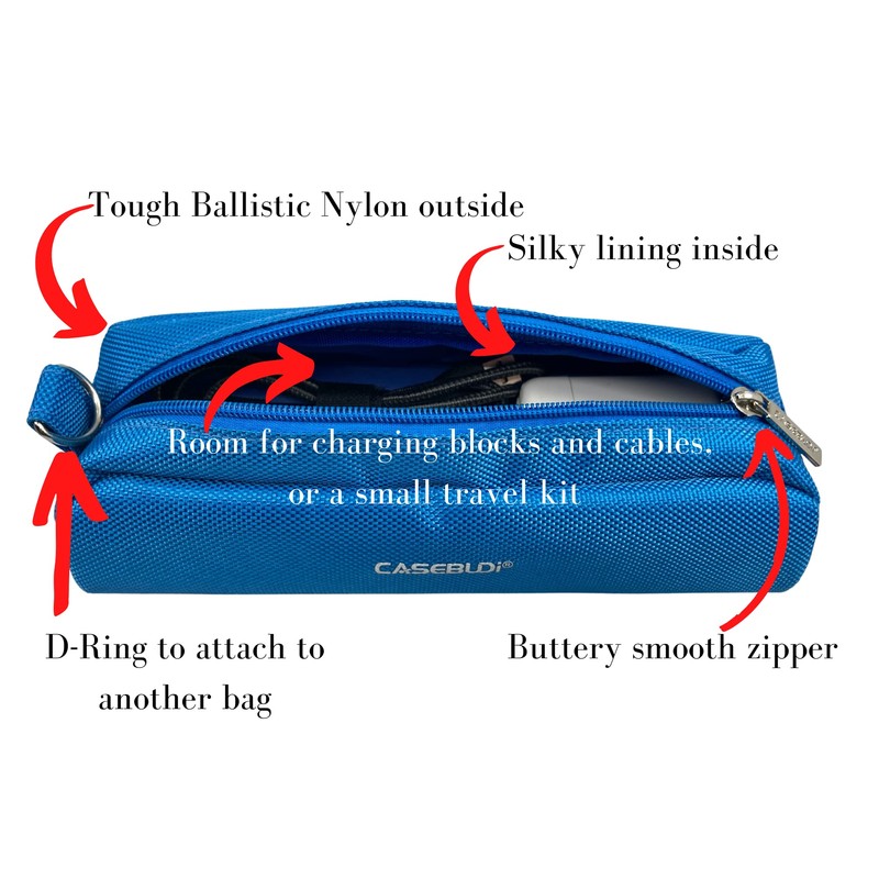Ballistic nylon carry zippered organizing pouch is perfect for the cords cables and charging blocks we all carry. Ballistic Nylon takes travel abuses well and looks great over time. This slim case fits in other travel bags, backpacks, or as a car organizer. D-ring can be hooked on other bags. It is also sized nicely for a few toiletry accessories toothpaste, toothbrush, razor, and deodorant, or use one for makeup on the go. This case comes in several fun colors to keep different gear coordinated. Note - cables and chargers are obviously not included, but are used as an example what can easily fit in the case.