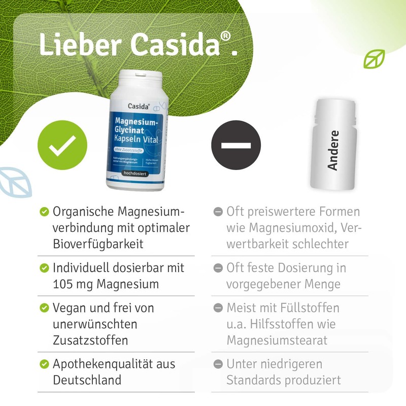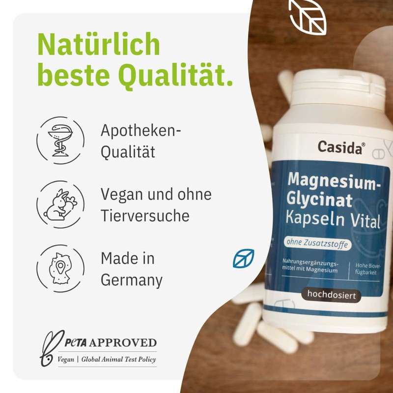 Casida Casida? magnesium glycinate capsules high dosage - magnesium bisglycinate capsules, 745mg magnesium glycinate per capsule, of which 105mg elemental magnesium, laboratory tested, produced in Germany - 120 capsules.