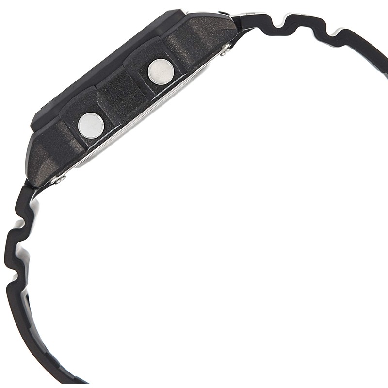 Cutting-edge technology combines modern design in this casio men's analog digital sport watch. Large push buttons on either side of the bezel make for easy operation, the durable, black resin case backgrounds a bold, black dial that features a world map time zone display, an analog sub-dial with arabic numbers every five minutes, and a bright, digital display with day, date, and month information. The strong, black resin band is accented with textured details on the links and fastens with an adjustable buckle for the perfect fit. With a countdown timer, five daily alarms, 12/24 hour formats, mute function, 10-year battery, and a water resistant depth of 330 feet (100 meters), this high-performance timepiece will accompany you for years to come.