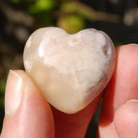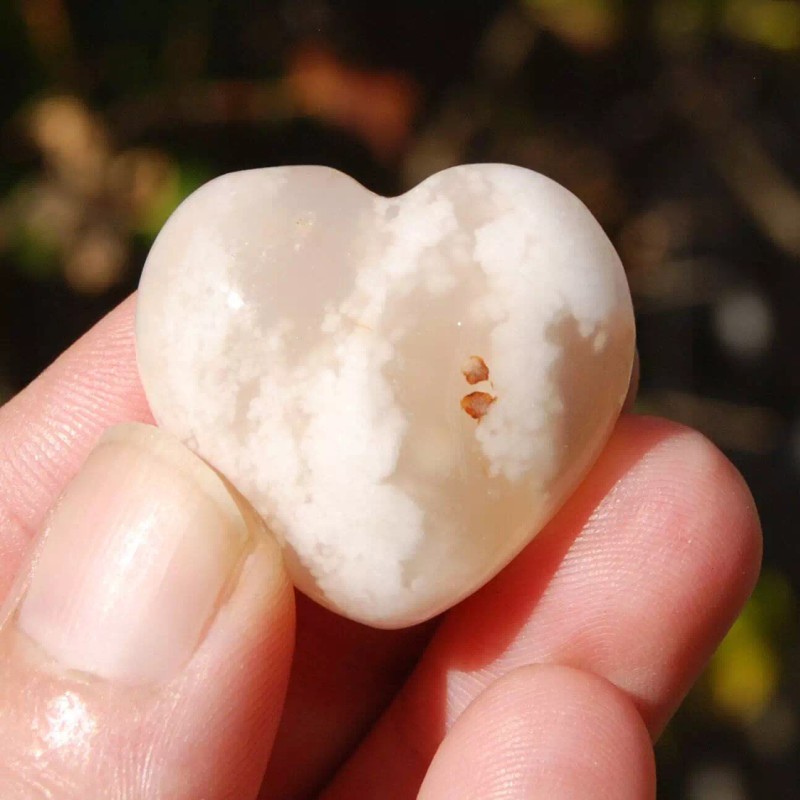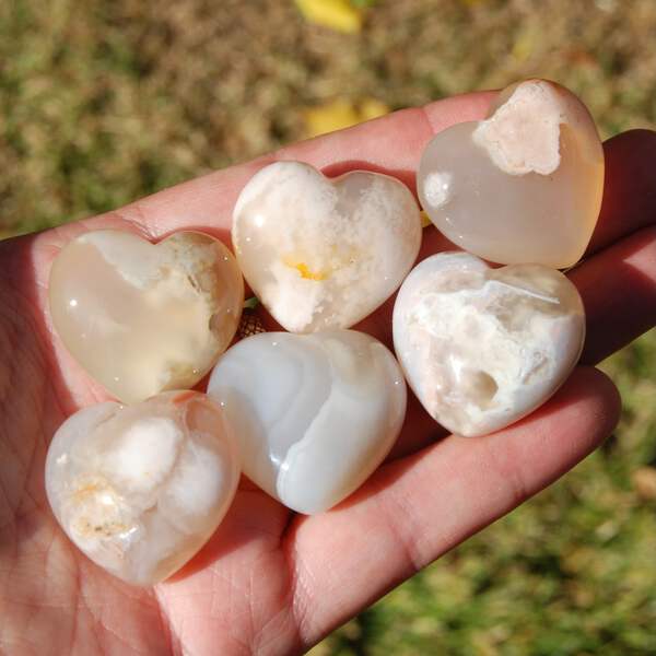 For your consideration are thedse beautiful polished Sakura Agate (aka Flower Agate) heart shaped crystal palm stones from Madagascar. The 'flowers' you see are inclusions of fossil coral suspended in Chalcedony. They measure approximately 30 millimeters wide (1.15 to 1.2 inches) and are sold by the piece.This listing is for ONE intuitively selected Sakura Agate crystal heart. I have photographed several to illustrate variation.Flower agate promotes the manifestation of your dreams and life's pursuits. It encourages one to take control of their life and live it to its fullest. It is a great stone for business owners hoping to expand their business or those starting a new business or venture in their life.Chakra: Root, Heart
