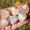 For your consideration are thedse beautiful polished Sakura Agate (aka Flower Agate) heart shaped crystal palm stones from Madagascar. The 'flowers' you see are inclusions of fossil coral suspended in Chalcedony. They measure approximately 30 millimeters wide (1.15 to 1.2 inches) and are sold by the piece.
