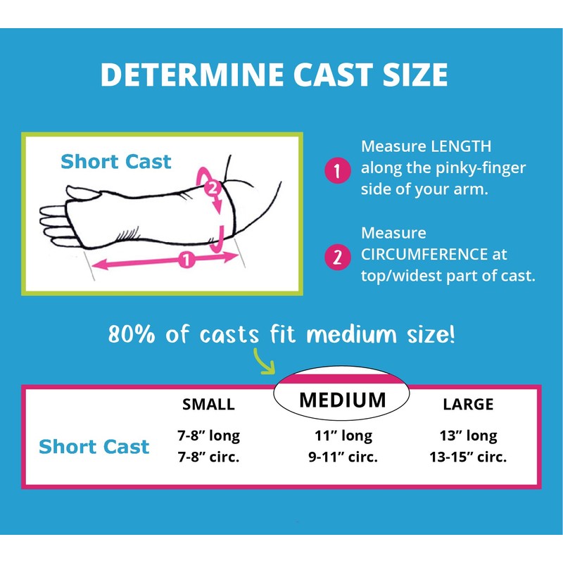 - MEASURING DIRECTIONS - All measurements are based on the size of your cast or bandage, not the injured body part. Measure length along the pinky side of the cast from one end to the other. Measure circumference around cast at widest point (usually forearm or bicep).