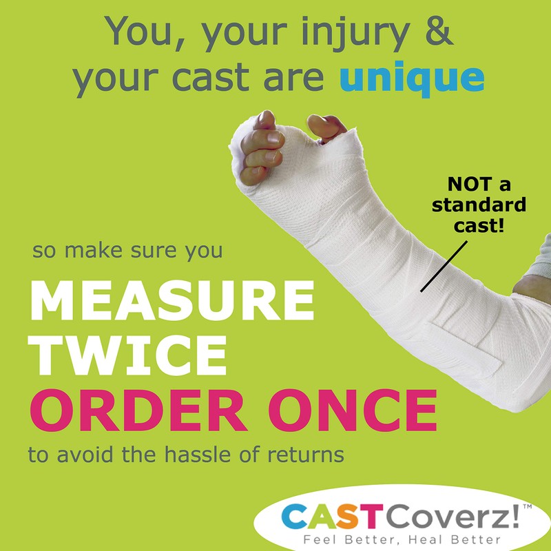 - MEASURE TWICE AND ORDER ONCE to avoid disappointment and the hassle of exchanges or returns. Size should be determined by careful measurement, not the age of the user. These covers are for standard arm casts only. If your thumb or fingers are casted, or you have had surgery with pins, you'll need a different product.