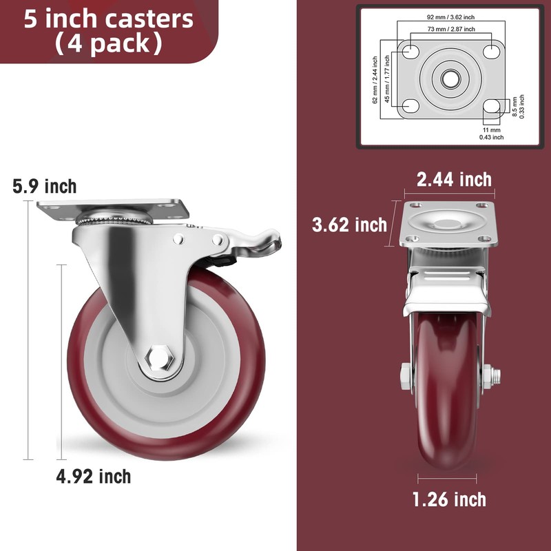 - Extremely Durable and Sturdy - Our 5 inch casters set of 4 Heavy duty are made from zinc plated steel, solid steel support which gives them a long lifespan and makes them resistant to corrosion and rust. Each industrial casters wheel can bear 475lbs of load, making a total of 1900lbs load capacity for 4 wheels