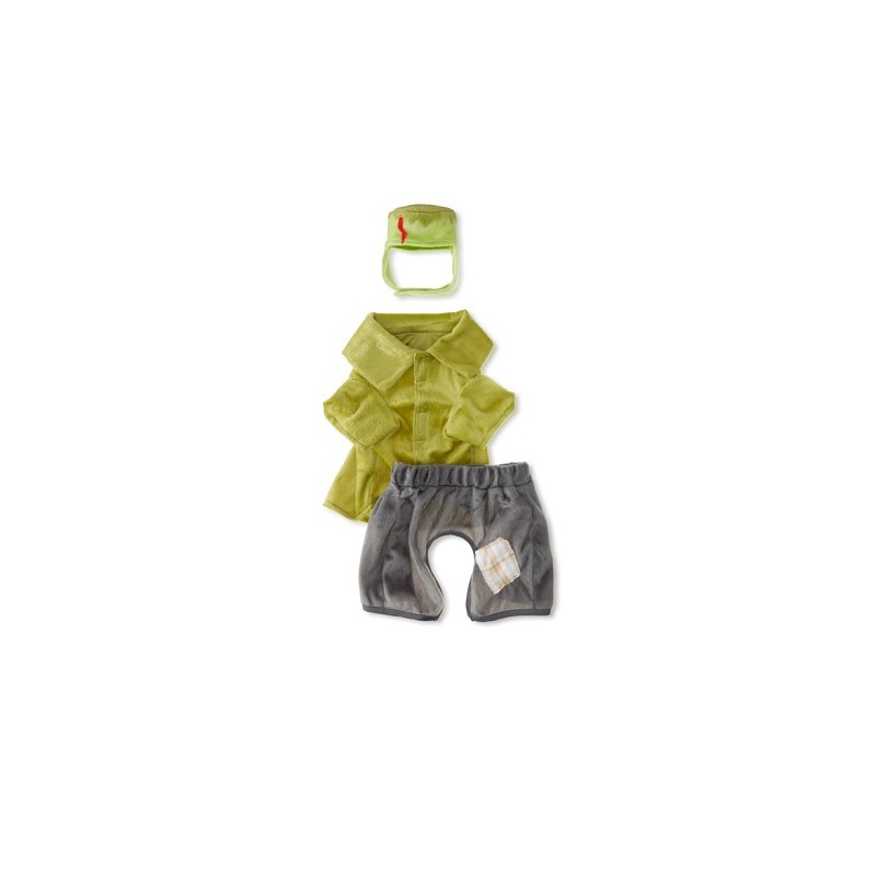 • Adorable details like a red scar on the headpiece, a large collar on the cozy green jacket and patches on the soft gray pants