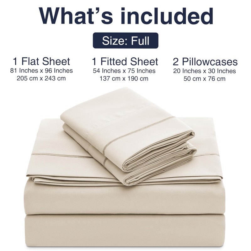 - 4-Piece Full Bed Sheet Set: Casual Living Sheet Set contains 1 flat sheet with detail stitch at 81-inch x 96-inch or 205cm x 243cm, 1 fitted sheet at 54-inch x 75-inch or 137cm x 190cm and 2 envelope pillowcases at 20-inch x 30-inch or 50cm x 76cm.