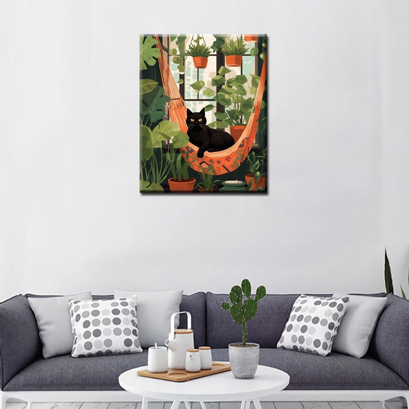 Cat and Pottings DIY Paint by Numbers for Adults Black Cat Laying on Hammock Surrounded by Green Plants DIY Oil Painting Acrylic Paint Art Graffiti Painting Kit Canvas 16x20 Inch(without Frame )