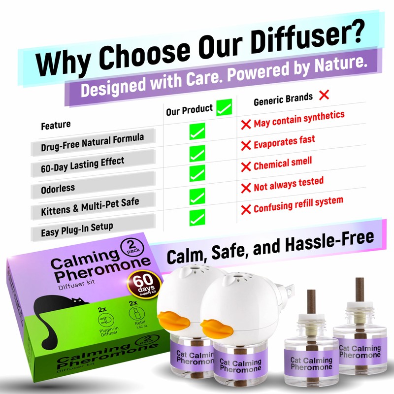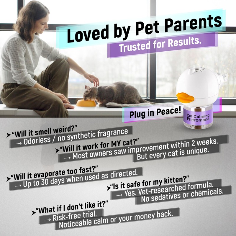 - For Happy and Calm Pets: Looking for a gentle and effective way to soothe your cat during stressful situations? Our cat calming pheromone diffuser uses safe, pet-friendly ingredients to help your feline feel at ease, turning your home into a peaceful and secure environment.