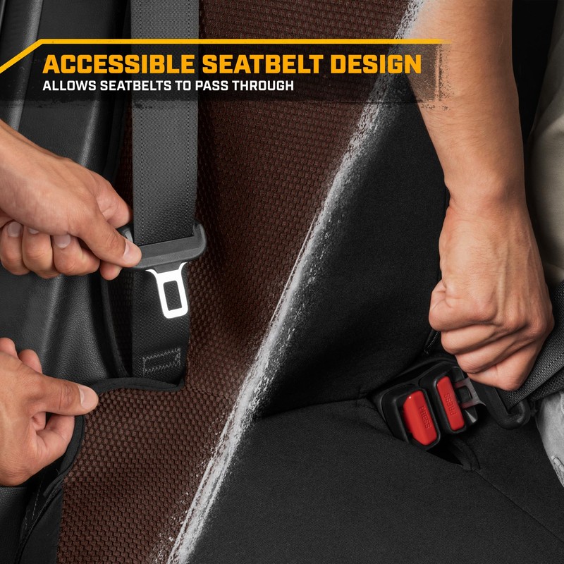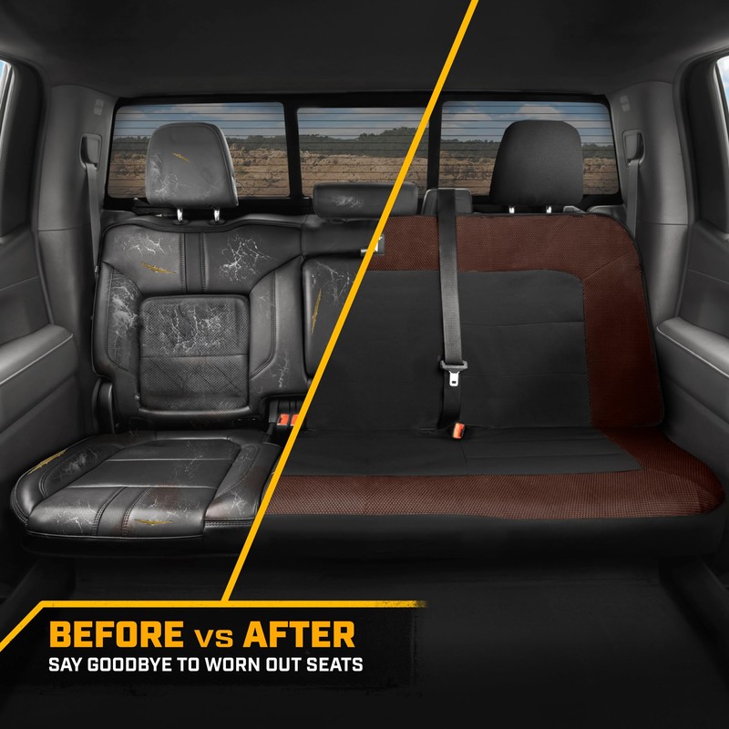 Cat? FlexFit 60/40 Split Bench Back Seat Covers for Trucks, SUVs, & Cars, and Vans:Upgrade your vehicle's interior with our Universal Cat? FlexFit Rear Seat Cover. Designed to fit most cars, SUVs, trucks, and minivans, this back seat covers for SUV, car, and truck will enhance the rear seat protection. Whether you're refreshing your car's interior or adding an extra layer of defense, these rear bench seat liners provide the perfect solution.These covers offer a snug, customized fit for most vehicle seats. While designed for a universal fit, minor adjustments may be necessary for a flawless look in your specific vehicle.Crafted from durable canvas and neoprene material, these seat covers provide excellent protection against spills, stains, dirt, sweat, and everyday wear and tear. Keep your seats looking fresh and new with this high-quality rear seat cover.The adjustable openings for seat belts ensure full functionality of safety features, while the universal fit (55" x 44") makes it compatible with most cars, trucks, and SUVs. Easy to install and maintain, it's the perfect solution for keeping your seats clean and safe.Compatible with popular car and truck models including Ford (Explorer, Ranger, Escape, Expedition, Fusion, Lightning Mustang), Toyota (Tacoma, Rav4, Highlander, Prius, Tundra, Camry, Corolla), Chevrolet, Chevy Traverse, Dodge, Honda (Civic, Accord, CRV, Pilot, Odyssey, HR-V), Nissan (Sentra, Altima), Jeep, Tesla, Kia, Audi, Subaru Outback, Hyundai, BMW, Mercedes, Lexus, and more!