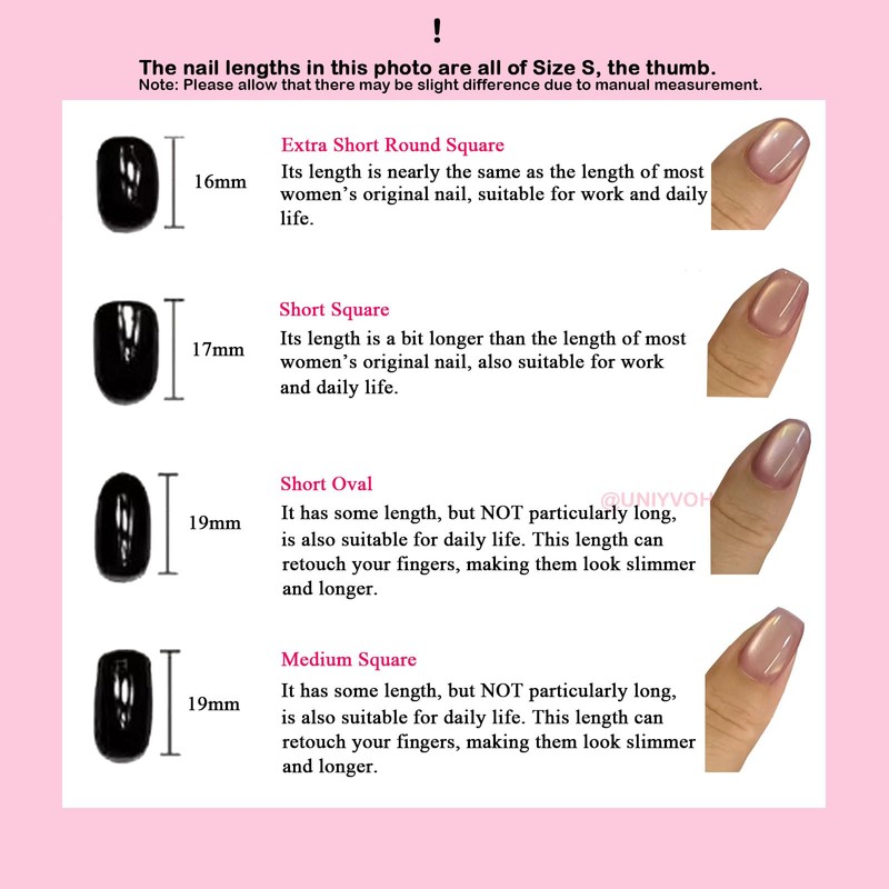 3.Please measure your nails size correctly before making an order. The “XS/S/M/L”selections on the page means “X-Small/Small/Medium/Large” sizes, NOT nails length. If you want to know how long the false nails are, please refer to the product photos which shows the size chart.