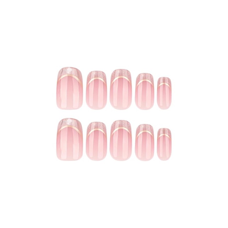 Cat Eye Press on Nails Medium Squoval with Gold Line Design, Pink French Nail Nude Tip Glossy Press Glue on Nails for Women with Kit, Reusable Soft Gel Stick on Fake Nail with Designs Perfectly Fit